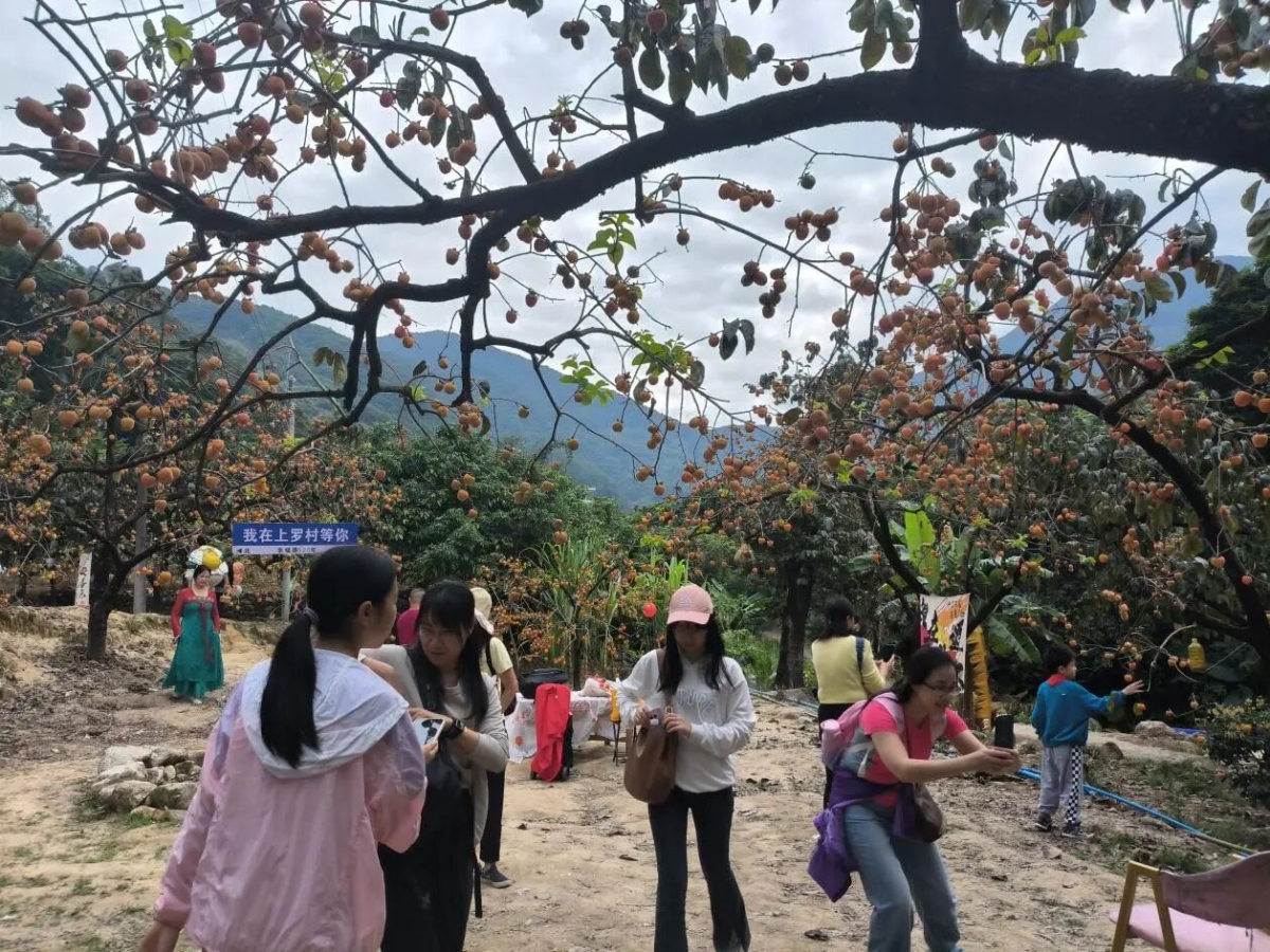 早晨8点,大家乘车出发前往本次旅程的第一站——从化上罗村柿子园。上罗村以种植鸡心红柿闻名,拥有300余年种植历史。车辆还未抵达上罗,沿途已皆是“柿景”,成片的柿林蔚然成海,一颗颗柿子犹如小巧玲珑的红灯笼密密匝匝地挂满枝头,勾勒出一幅绚烂的丰收图景。大家迫不及待地下车欣赏,漫步柿园中,尽情采撷这醉人的秋光,用镜头定格下这“柿柿”如意的美好瞬间,让身心在硕果累累的田园风光中得到彻底的舒展与放松。