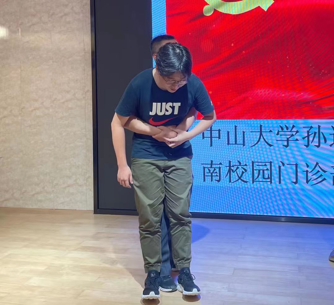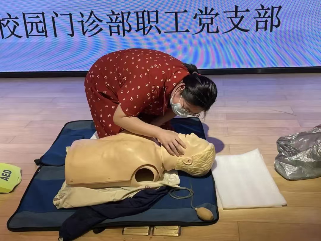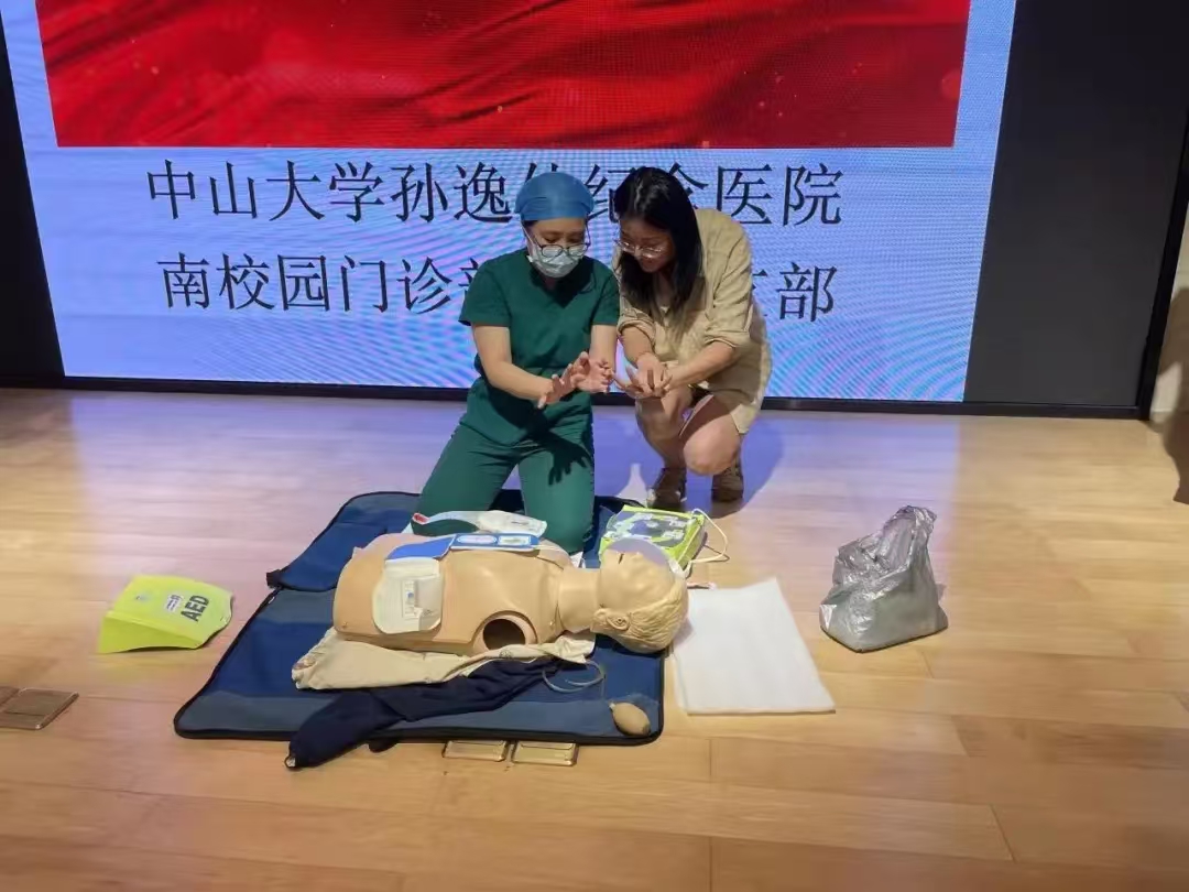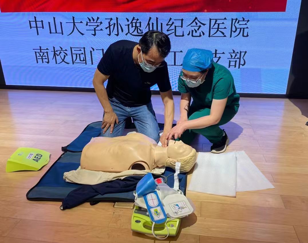 现场演练环节,江医生以模拟橡胶人为“急救对象”,现场演示胸外按压、人工呼吸的操作方式,并进行AED除颤仪的操作训练。罗医生就普通外伤的现场处理和气道异物处理的成人海姆立克法做演练示范。