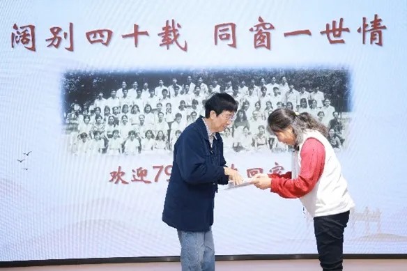 最后,黄飞红老师为校友一一送出了学院准备的特殊礼物——当年的学籍表。校友们惊喜地接过礼物,与老师们合影,留下四十年后重逢相聚的纪念。活动在校友与老师们的温馨大合影后圆满结束。