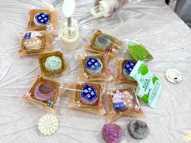 活动伊始,学院准备的丰富物料就已整齐摆放:雪白的饼皮,精心挑选的各式馅料与精美的模具一应俱全。在学生志愿者的耐心指导下,师生们纷纷戴上一次性手套,学习制作冰皮月饼。从饼皮的擀制、馅料的包裹,到模具的压花成型,大家都兴致勃勃、专心致志地投入月饼制作活动。其中,不少同学是第一次亲手做月饼,虽手法略显生涩,却满怀热情,将祝福与心意一点点揉进香甜的馅料中。小小的月饼,在此刻不仅是应节的美食,更是连接情谊、传递温暖的纽带,让团圆的寓意在动手实践中变得真实可感。这是对传统节日的致敬,也是一次极具意义的劳动教育。