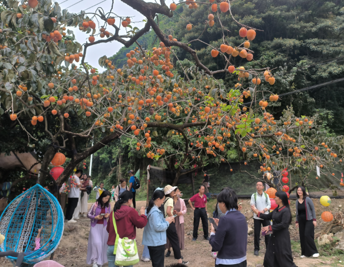 早晨8点,大家乘车出发前往本次旅程的第一站——从化上罗村柿子园。上罗村以种植鸡心红柿闻名,拥有300余年种植历史。车辆还未抵达上罗,沿途已皆是“柿景”,成片的柿林蔚然成海,一颗颗柿子犹如小巧玲珑的红灯笼密密匝匝地挂满枝头,勾勒出一幅绚烂的丰收图景。大家迫不及待地下车欣赏,漫步柿园中,尽情采撷这醉人的秋光,用镜头定格下这“柿柿”如意的美好瞬间,让身心在硕果累累的田园风光中得到彻底的舒展与放松。