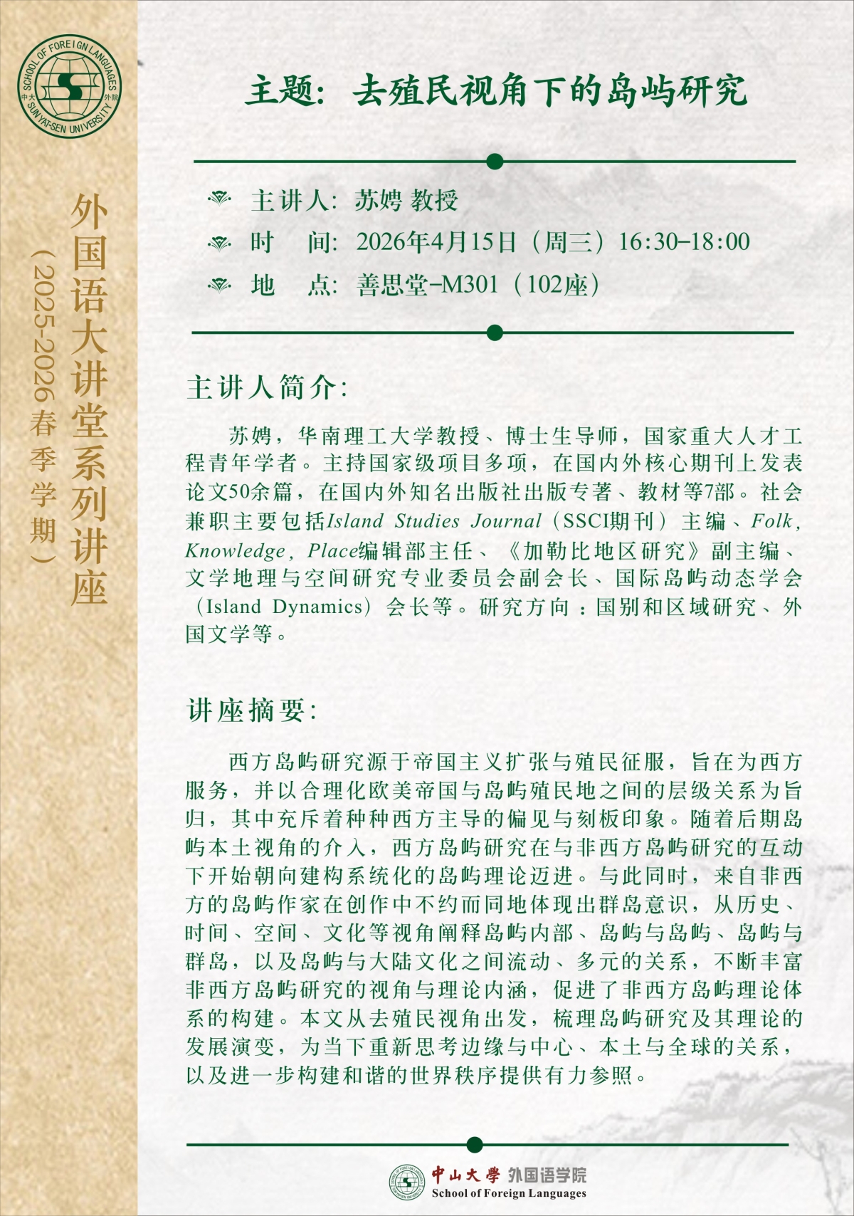 导航痕迹 彩票 去殖民视角下的岛屿研究 扫描此二维码分享 去殖民视角下的岛屿研究 发布人:罗锦芬 发布日期:2026-04-10 活动时间 2026年04月15日 16:30 - 2026年04月15日 18:00 活动地址 善思堂M301 主讲人 苏娉 教授
