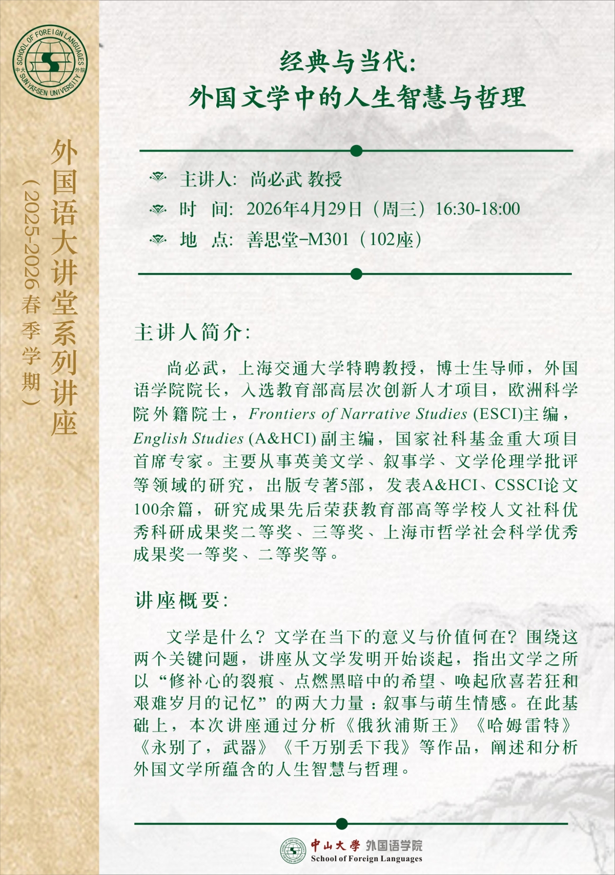 导航痕迹 彩票 经典与当代:外国文学中的人生智慧与哲理 扫描此二维码分享 经典与当代:外国文学中的人生智慧与哲理 发布人:罗锦芬 发布日期:2026-04-21 活动时间 2026年04月29日 16:30 - 2026年04月29日 18:00 活动地址 善思堂M301 主讲人 尚必武 教授